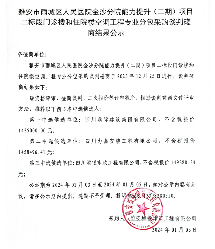 雅安市雨城區(qū)人民醫(yī)院金沙分院能力提升(二期)項(xiàng)目二標(biāo)段門診樓和住院樓空調(diào)工程專業(yè)分包采購(gòu)談判磋商結(jié)果公示