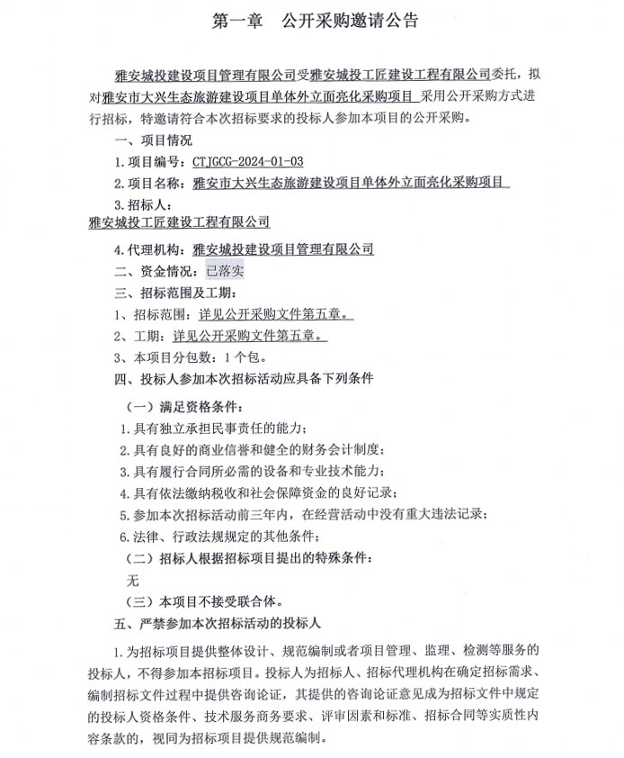 雅安市大興生態(tài)旅游建設(shè)項(xiàng)目單體外立面亮化采購(gòu)項(xiàng)目公開采購(gòu)邀請(qǐng)公告