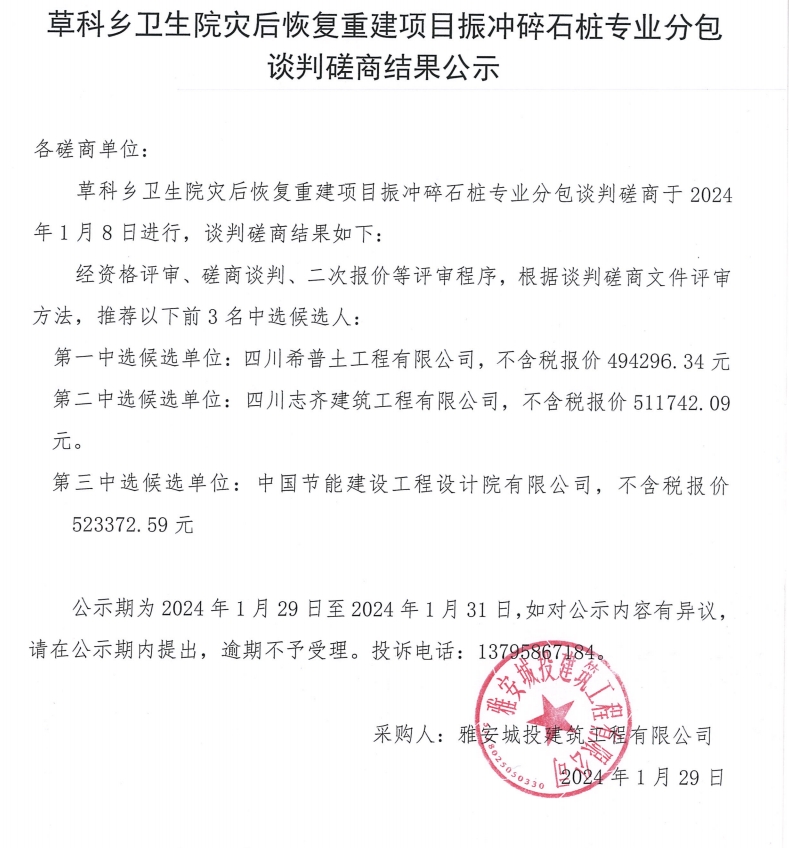 草科鄉(xiāng)衛(wèi)生院災(zāi)后恢復(fù)重建項目振沖碎石樁專業(yè)分包談判磋商結(jié)果公示