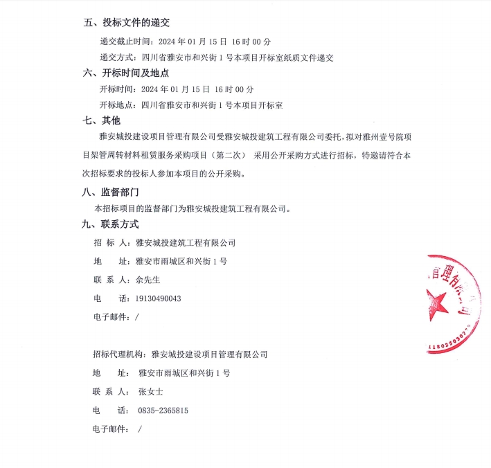 雅州壹號院項目架管周轉(zhuǎn)材料租賃服務(wù)采購項目(第二次)公告