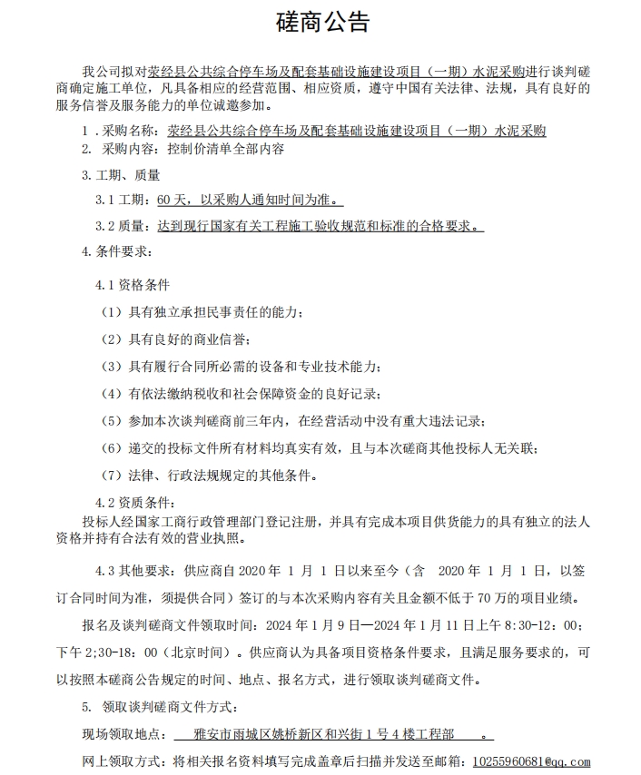 滎經(jīng)縣公共綜合停車場及配套基礎(chǔ)設(shè)施建設(shè)項目(一期)水泥材料采購談判磋商公告
