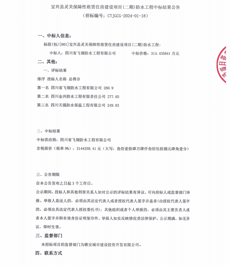 寶興縣靈關(guān)保障性租賃住房建設(shè)項(xiàng)目(二期)防水工程中標(biāo)結(jié)果公告