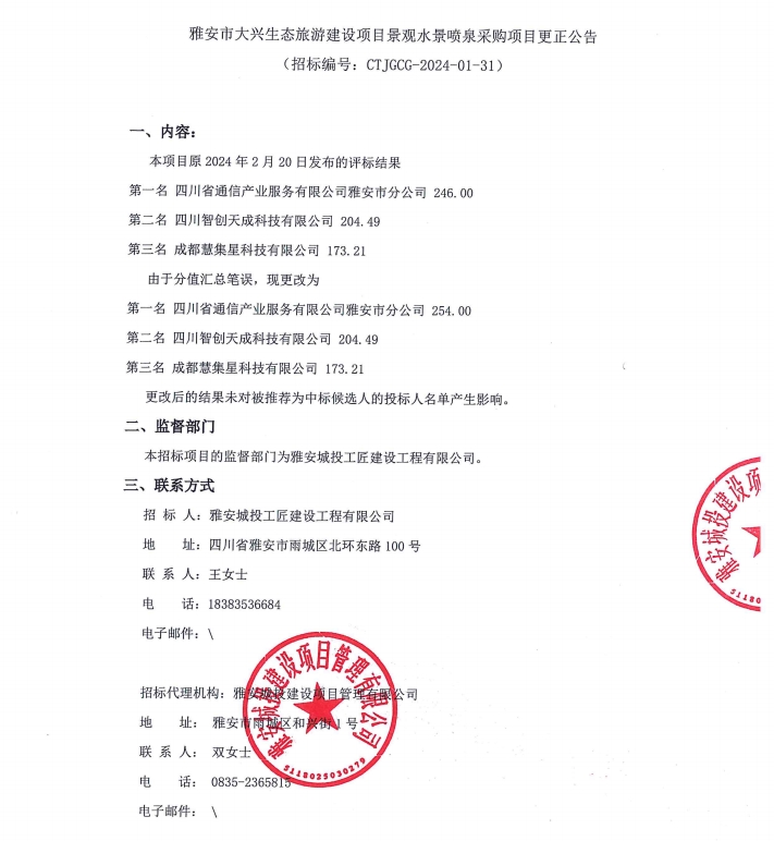 雅安市大興生態(tài)旅游建設(shè)項(xiàng)目景觀水景噴泉采購項(xiàng)目更正公告