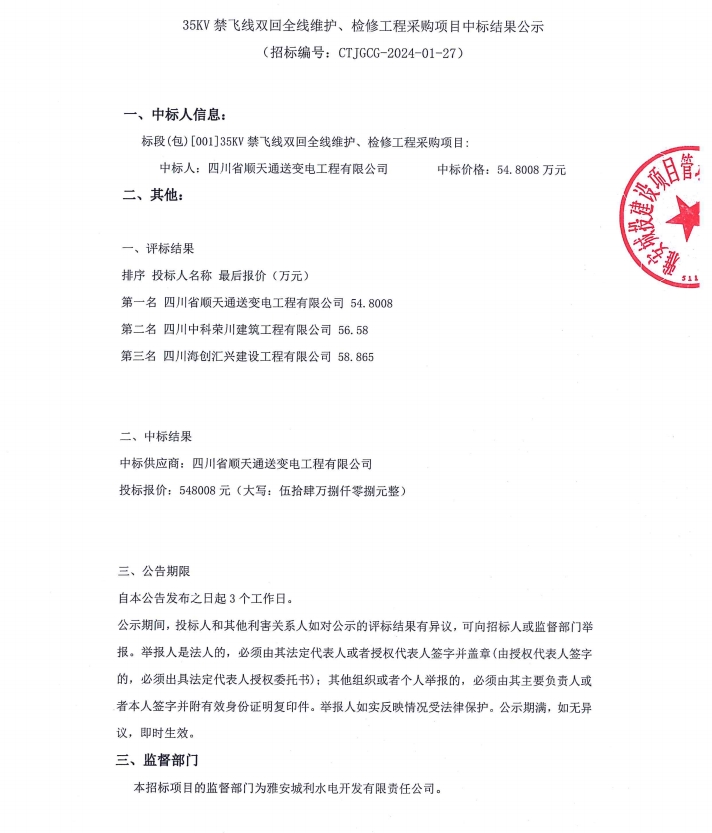 35KV禁飛線雙回全線維護、檢修工程采購項目中標結果公示