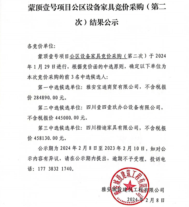 蒙頂壹號項目公區(qū)設備家具競價采購(第二次)結(jié)果公示