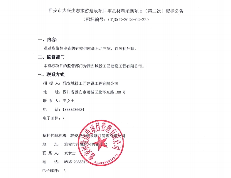 雅安市大興生態(tài)旅游建設(shè)項(xiàng)目零星材料采購(gòu)項(xiàng)目(第二次)廢標(biāo)公告