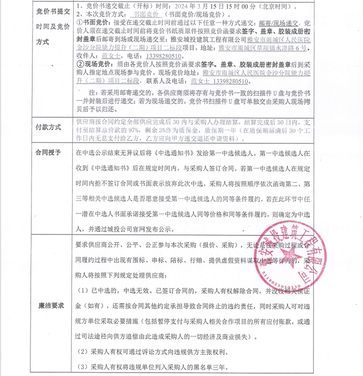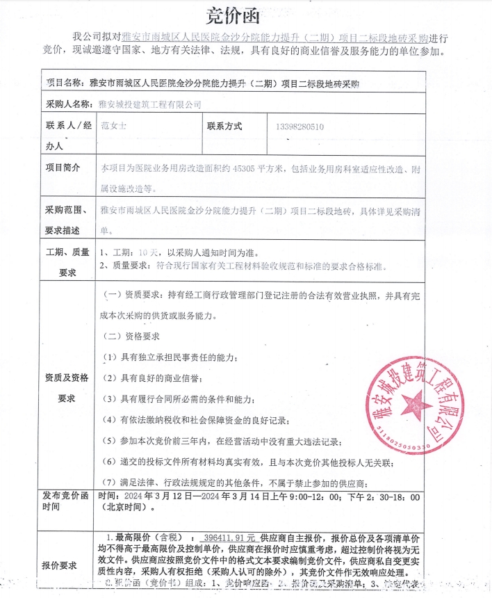 雅安市雨城區(qū)人民醫(yī)院金沙分院能力提升(二期)項目二標段地磚采購競價公告