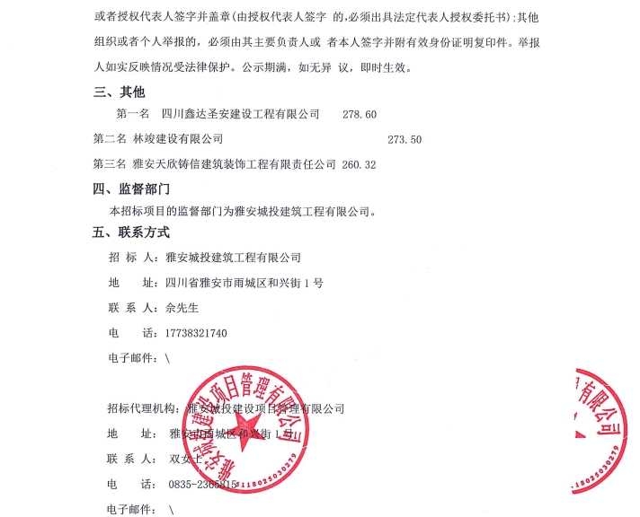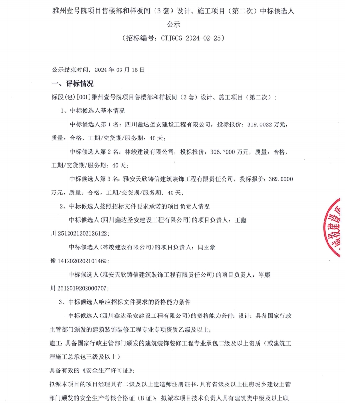 雅州壹號院項(xiàng)目售樓部和樣板間(3套)設(shè)計(jì)、施工項(xiàng)目(第二次)中標(biāo)候選人公示