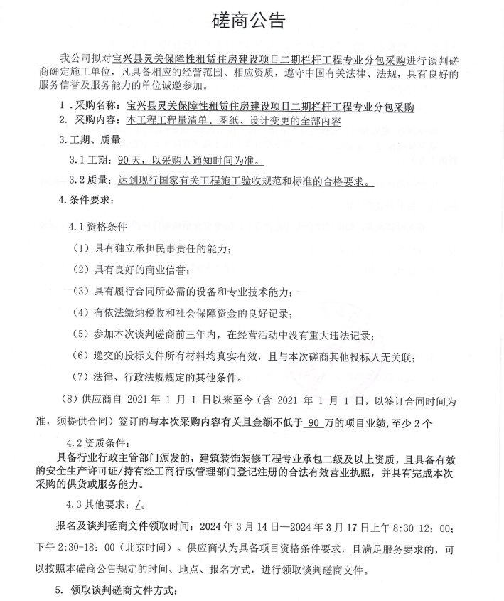 寶興縣靈關(guān)保障性租賃住房建設(shè)項(xiàng)目二期欄桿工程專業(yè)分包采購(gòu)磋商公告
