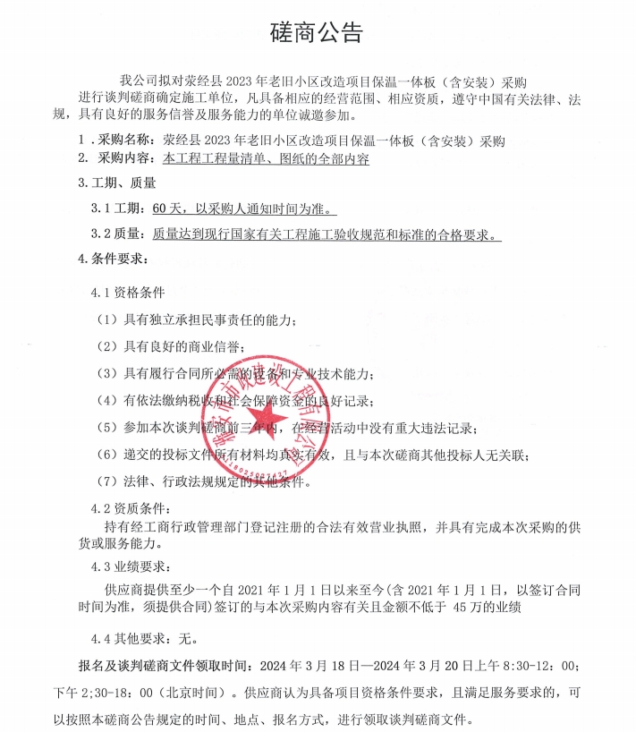 滎經(jīng)縣2023年老舊小區(qū)改造項(xiàng)目保溫一體(含安裝)磋商公告