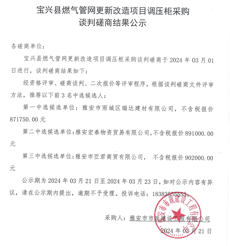 寶興縣燃氣管網更新改造項目調壓柜采購談判磋商結果公示