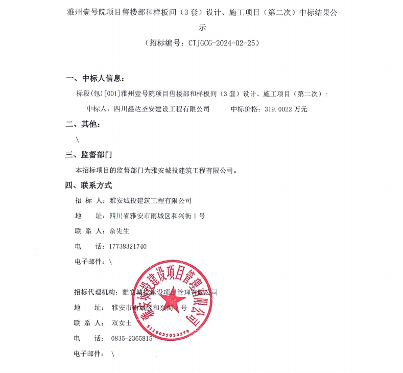 雅州壹號院項目售樓部和樣板間(3套)設(shè)計、施工項目(第二次)中標結(jié)果公示