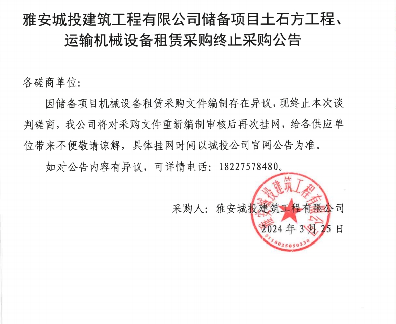 雅安城投建筑工程有限公司儲備項目土石工程、運輸機械設備租賃采購終止采購公告