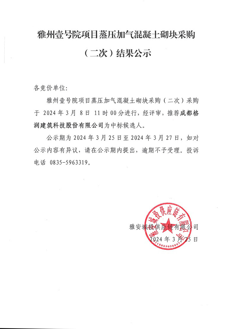 雅州壹號院項目蒸壓加氣混凝土砌塊采購(第二次)結果公示