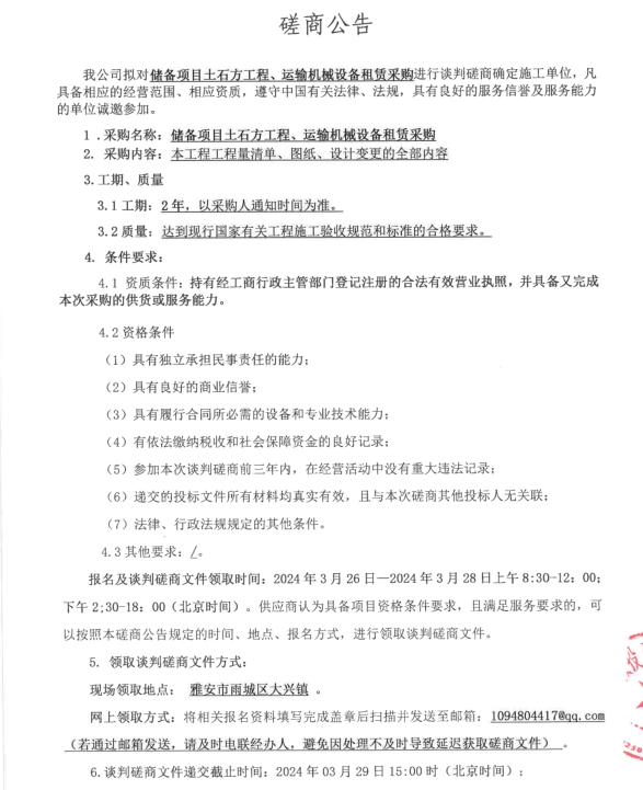 儲(chǔ)備項(xiàng)目土石方工程、運(yùn)輸機(jī)械設(shè)備租賃采購磋商公告