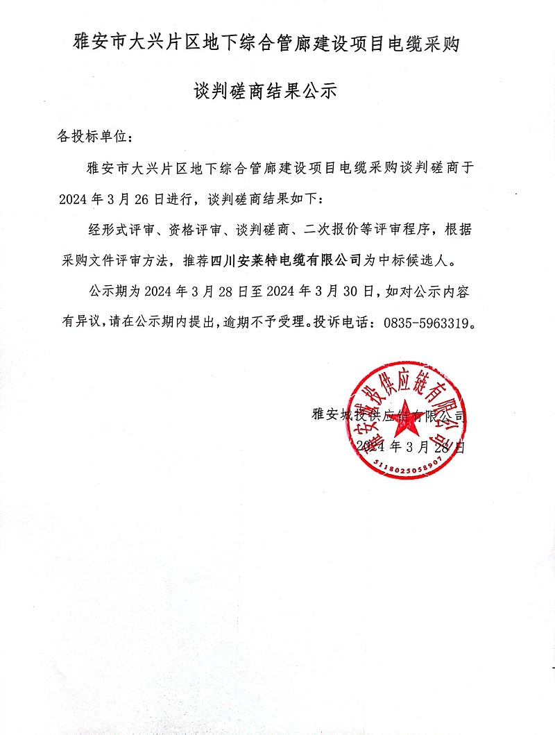 雅安市大興片區(qū)地下綜合管廊建設項目電纜采購談判磋商結果公示
