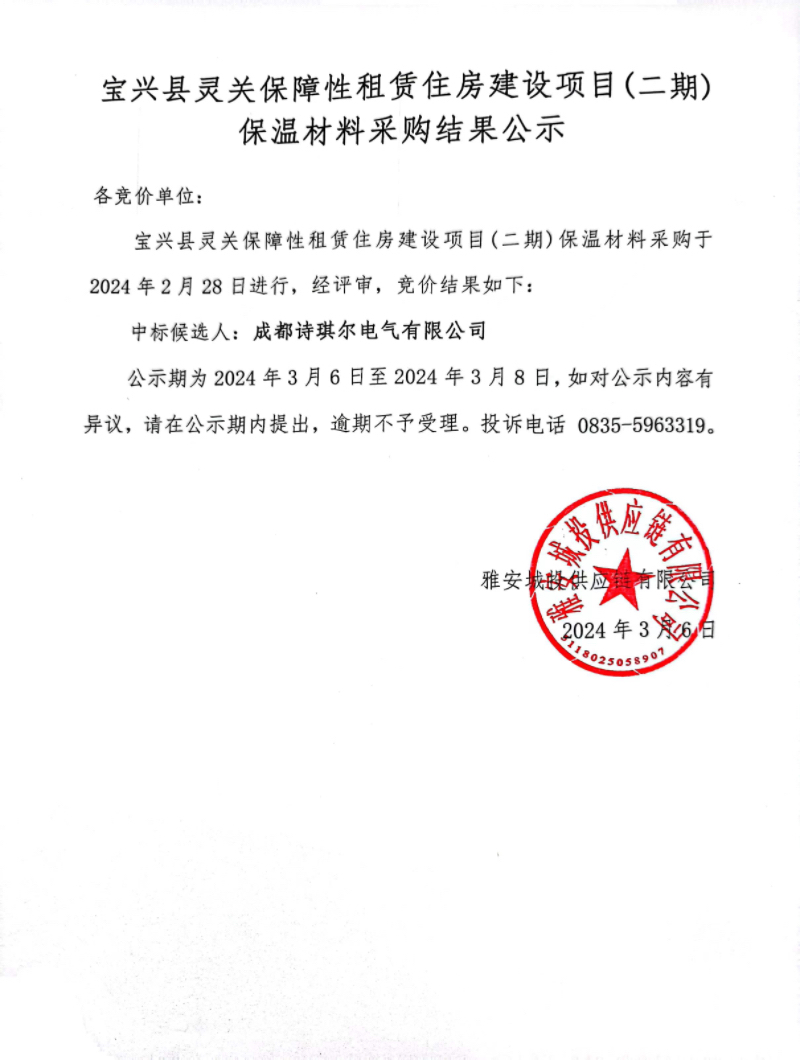 寶興縣靈關保障性租賃建設項目(二期)保溫材料采購結果公示