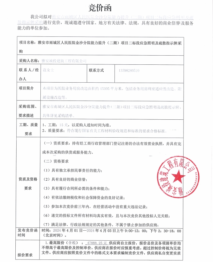 雅安市雨城區(qū)人民醫(yī)院金沙分院能力提升(二期)項(xiàng)目二標(biāo)段應(yīng)急照明及疏散指示牌采購競價公告