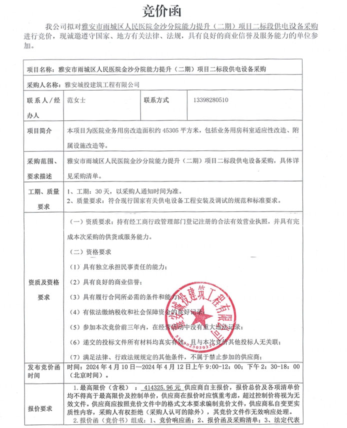 雅安市雨城區(qū)人民醫(yī)院金沙分院能力提升(二期)項(xiàng)目二標(biāo)段供電設(shè)備采購競價(jià)公告