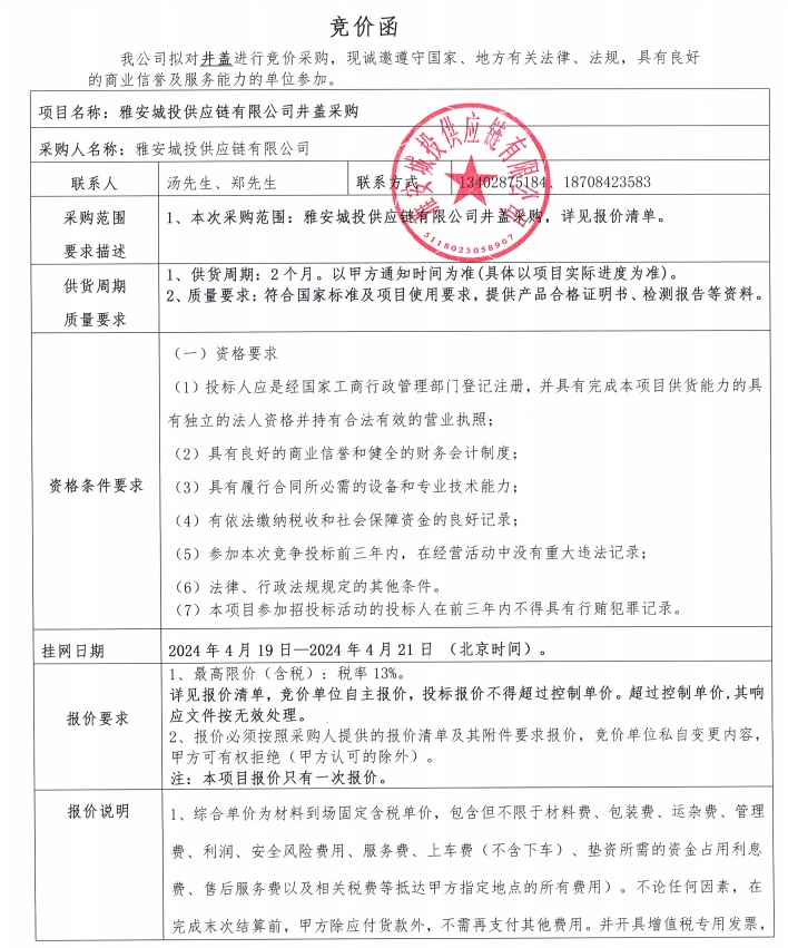 雅安城投供應鏈有限公司井蓋采購競價公告