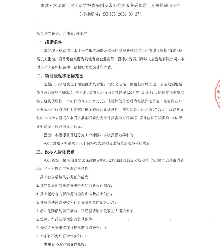 雅城·格調(diào)項目水土保持報告編制及水保監(jiān)測服務(wù)采購項目競爭性磋商公告