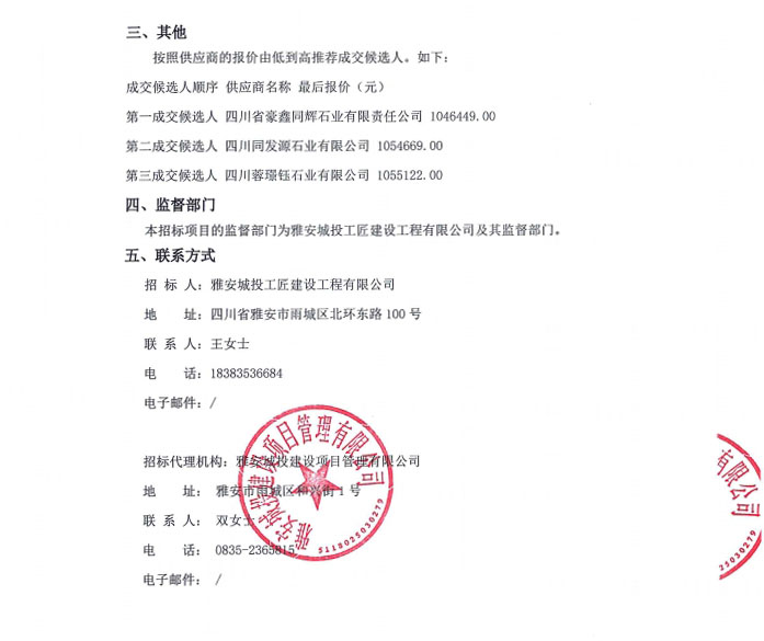 雅安市大興生態(tài)旅游建設(shè)項目花崗石采購項目(第二次)中標候選人公告