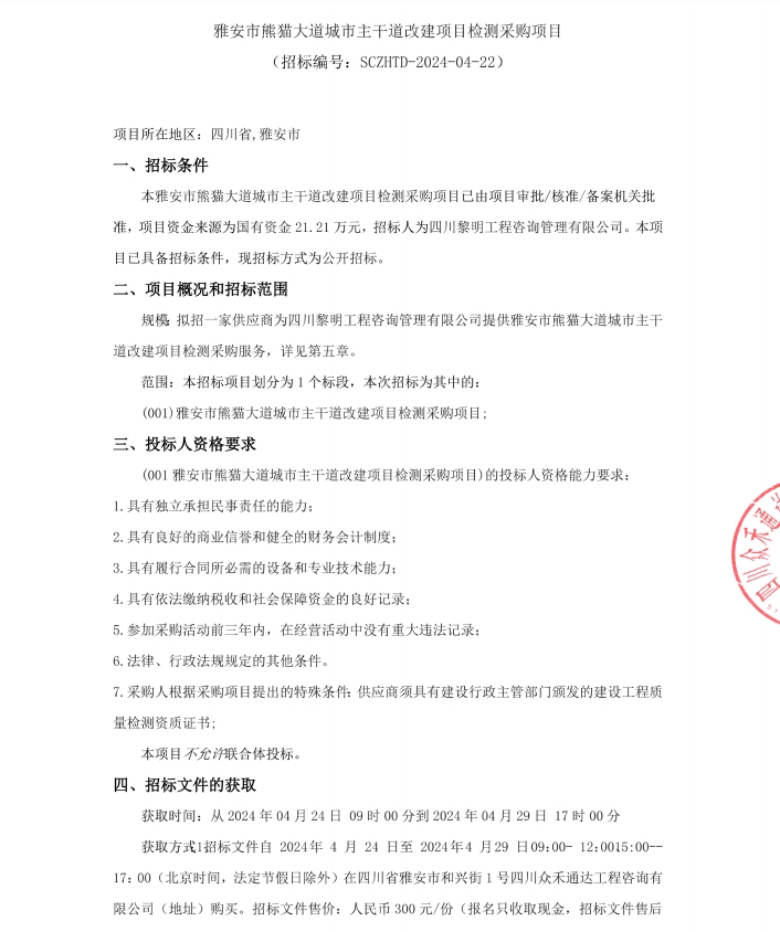 雅安市熊貓大道城市主干道改造項(xiàng)目檢測采購項(xiàng)目公告