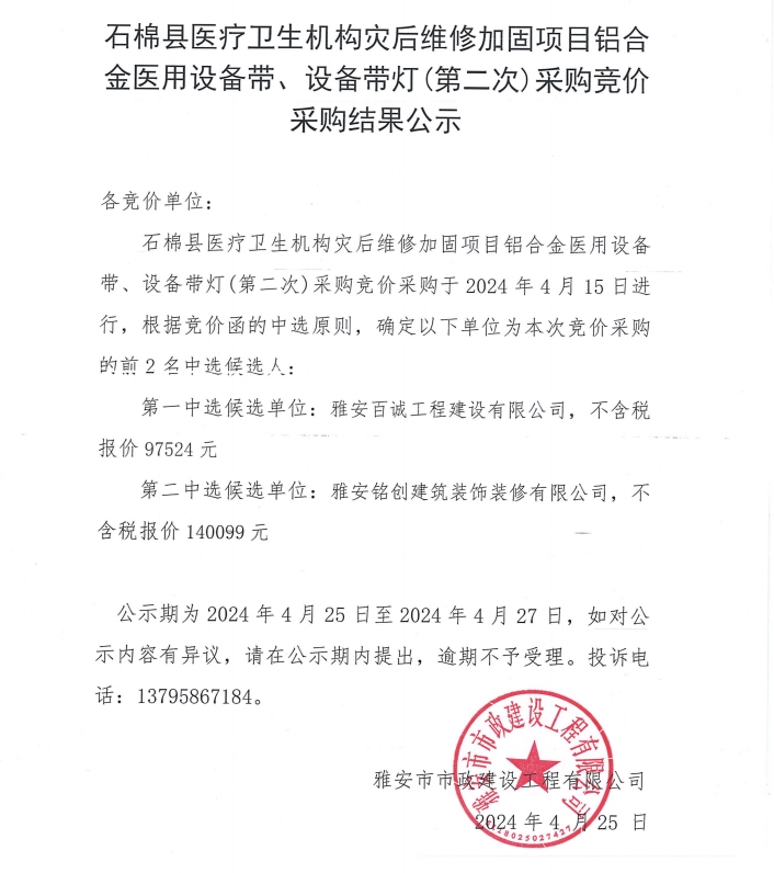 石棉縣醫(yī)療衛(wèi)生機(jī)構(gòu)災(zāi)后加固改造項(xiàng)目鋁合金醫(yī)用設(shè)備帶、設(shè)備帶燈(第二次)采購(gòu)競(jìng)價(jià)采購(gòu)結(jié)果公示