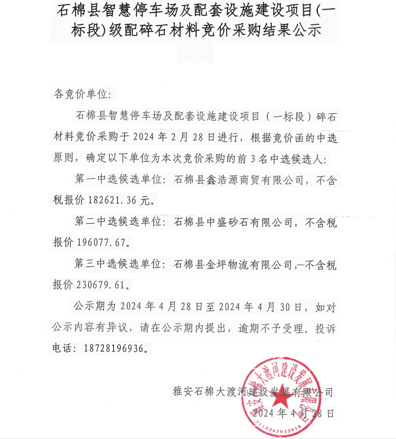 石棉縣智慧停車場及配套設施建設項目(一標段)級配碎石材料競價采購結果公示