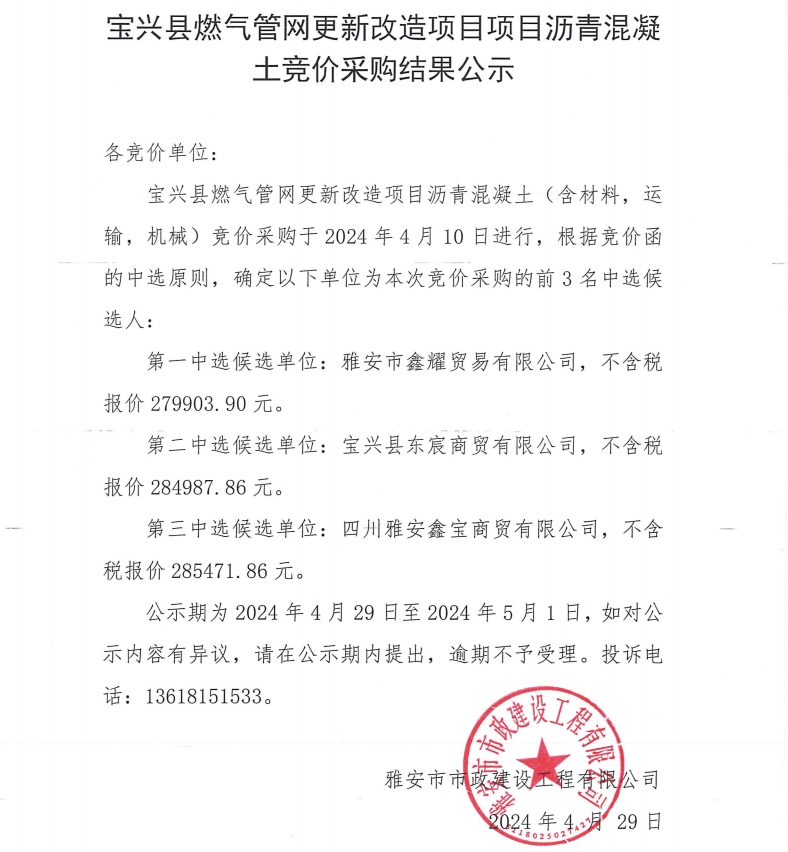 寶興縣燃?xì)夤芫W(wǎng)更新改造項(xiàng)目瀝青混凝土競(jìng)價(jià)采購(gòu)結(jié)果公示