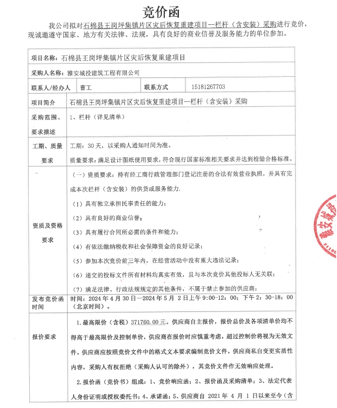 石棉縣王崗坪集鎮(zhèn)片區(qū)災(zāi)后恢復(fù)重建項目--欄桿(含安裝)采購競價公告