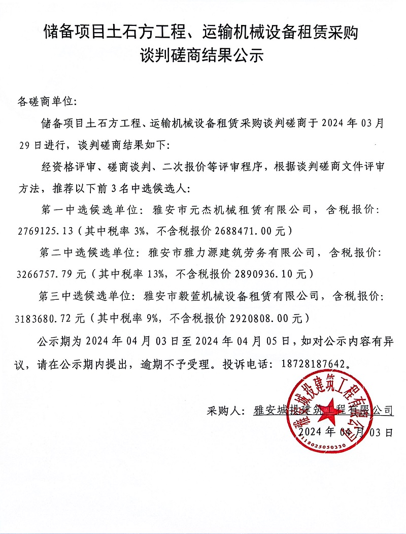 儲(chǔ)備項(xiàng)目土石方工程、運(yùn)輸機(jī)械設(shè)備租賃采購(gòu)談判磋商結(jié)果公示