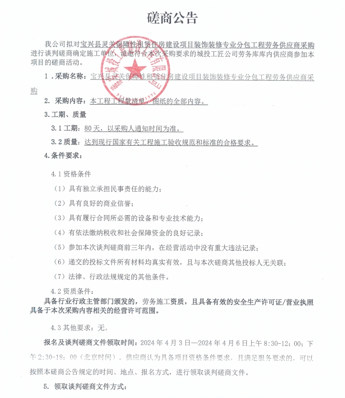 寶興縣靈關(guān)保障性租賃住房建設(shè)項(xiàng)目裝飾裝修專業(yè)分包工程勞務(wù)供應(yīng)商采購(gòu)磋商公告