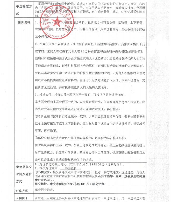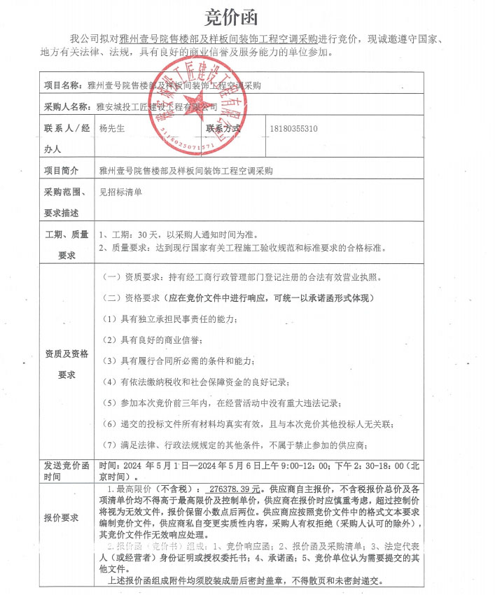 競價(jià)函-空調(diào)采購-雅州壹號(hào)院售樓部及樣板間