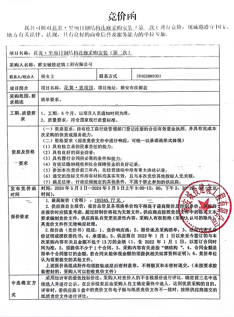 花襄·里項(xiàng)目鋼結(jié)構(gòu)連廊采購安裝(第二次)競價公告