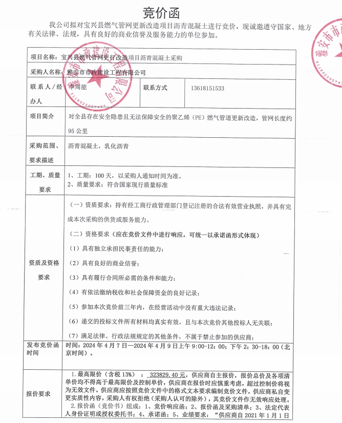 寶興縣燃?xì)夤芫W(wǎng)更新改造項(xiàng)目瀝青混凝土競價公告