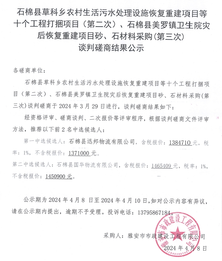 石棉縣草科鄉(xiāng)農(nóng)村生活污水處理設(shè)施恢復(fù)重建項(xiàng)目等十個(gè)工程打捆項(xiàng)目(第二次)、石棉縣美羅鎮(zhèn)衛(wèi)生院災(zāi)后恢復(fù)重建項(xiàng)目砂、石材料采購(第三次)談判磋商結(jié)果公示