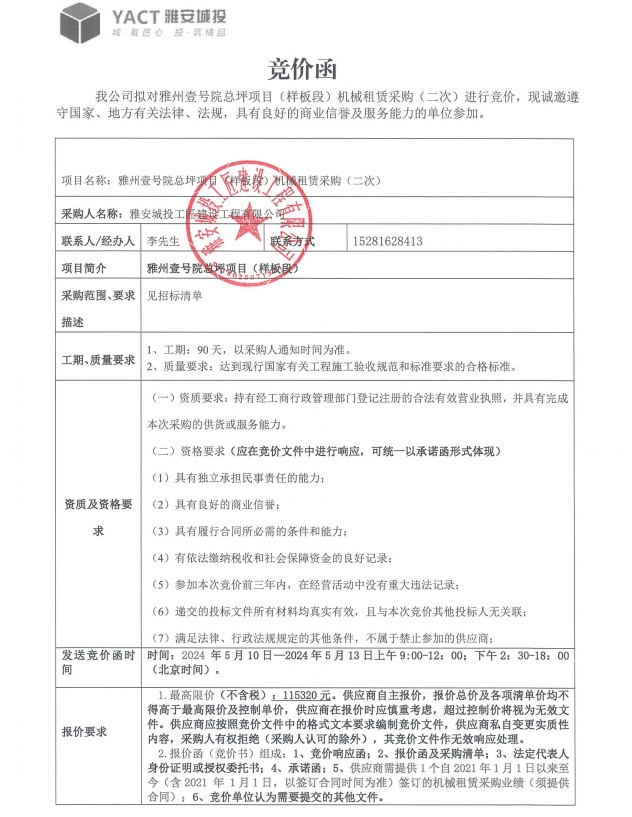 雅州壹號(hào)院總坪項(xiàng)目(樣板段)機(jī)械租賃采購(gòu)(二次)競(jìng)價(jià)公告