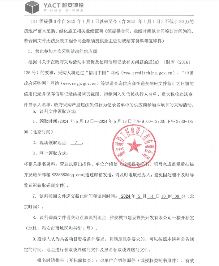 雅州壹號院總坪項目(樣板段)綠化材料采購 (二次)磋商公告