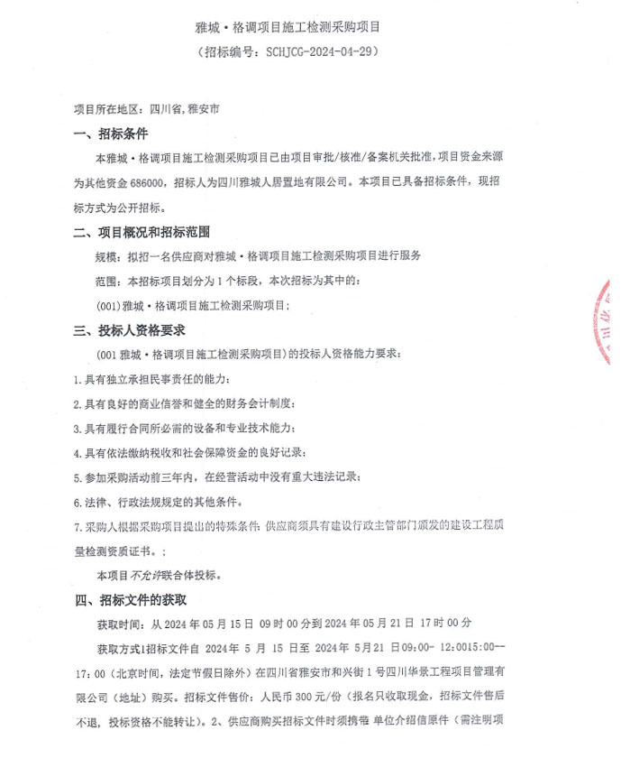 雅城·格調(diào)項(xiàng)目施工檢測(cè)采購項(xiàng)目公告