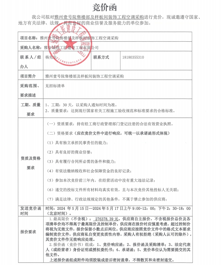 雅州壹號(hào)院售樓部及樣板間裝飾工程空調(diào)采購(gòu)競(jìng)價(jià)公告