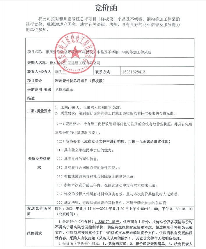雅州壹號(hào)院總坪項(xiàng)目(樣板段)小品及不銹鋼、鋼構(gòu)等加工件采購(gòu)競(jìng)價(jià)公告