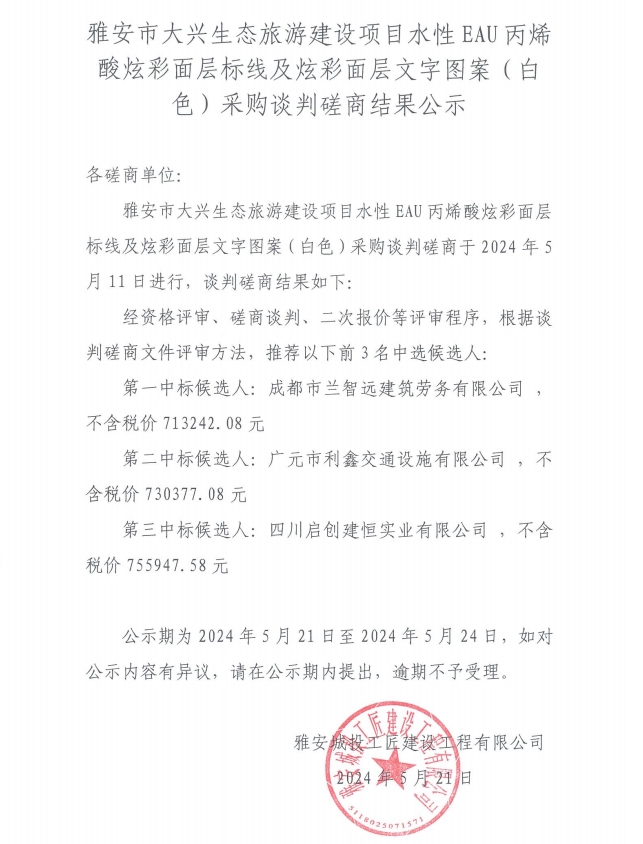 雅安市大興生態(tài)旅游建設(shè)項(xiàng)目水性EAU丙烯酸炫彩面層標(biāo)線及炫彩面層文字圖案(白色)采購談判磋商結(jié)果公示