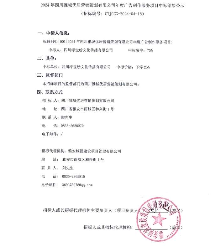 2024年四川雅城優(yōu)居營(yíng)銷策劃有限公司年度廣告制作服務(wù)項(xiàng)目中標(biāo)結(jié)果公示