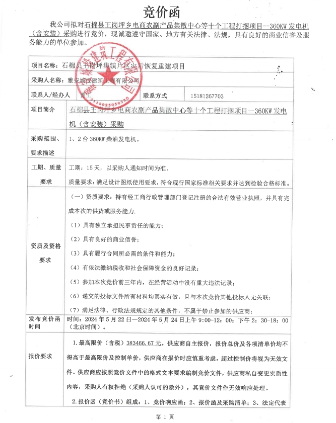 石棉縣王崗坪鄉(xiāng)電商農(nóng)副產(chǎn)品集散中心等十個工程打捆項目--360KW發(fā)電機(jī)(含安裝)采購競價公告