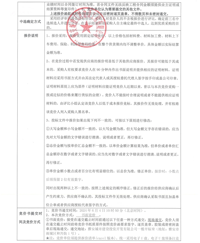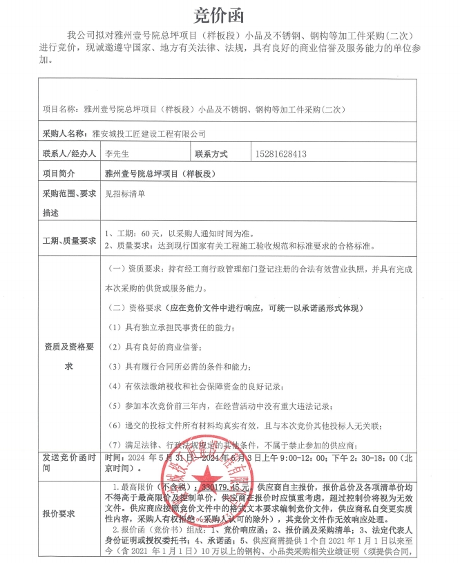 雅州壹號院總坪項目(樣板段)小品及不銹鋼、鋼構(gòu)等加工件的采購競價函