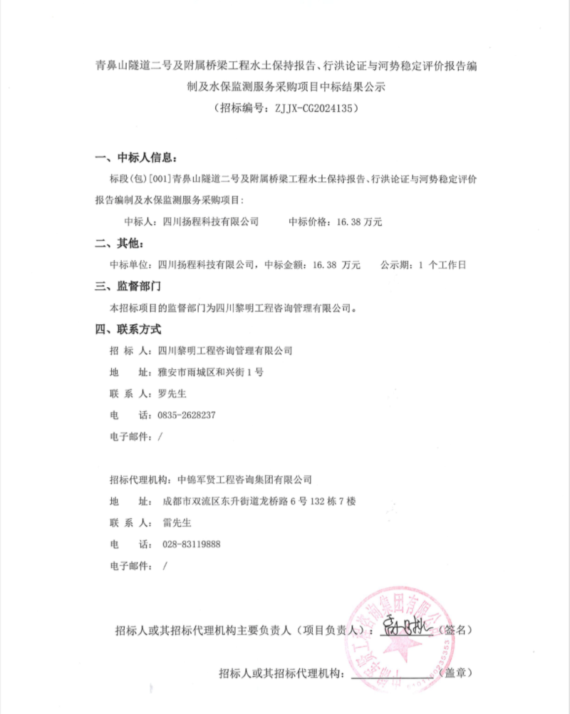 青鼻山隧道二號及附屬橋梁工程水土保持報(bào)告、行洪論證與河勢穩(wěn)定評價(jià)報(bào)告編制及水保監(jiān)測服務(wù)采購項(xiàng)目中標(biāo)結(jié)果公示
