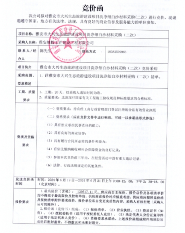 雅安市大興生態(tài)旅游建設(shè)項(xiàng)目洗凈細(xì)白沙材料采購(gòu)(二次)競(jìng)價(jià)公告