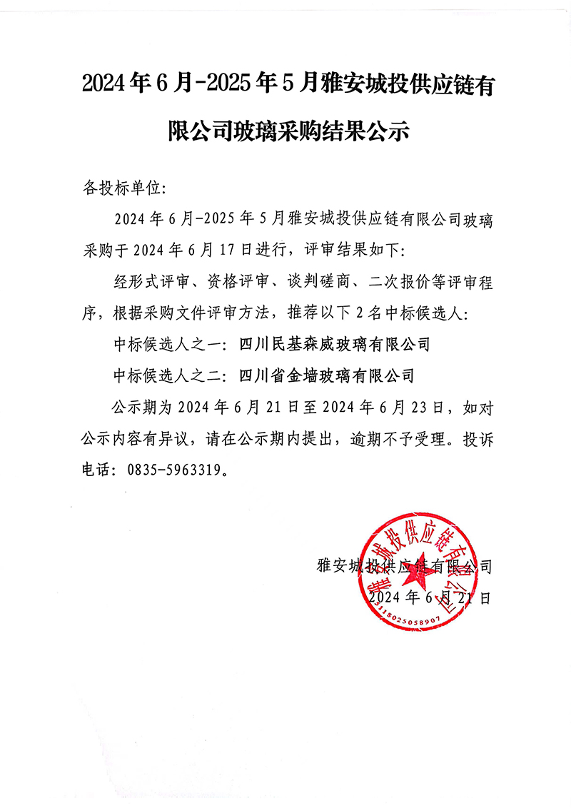 2024年6月-2025年5月雅安城投供應(yīng)鏈有限公司玻璃采購(gòu)結(jié)果公示