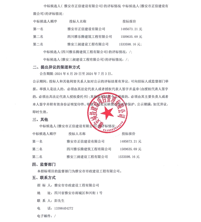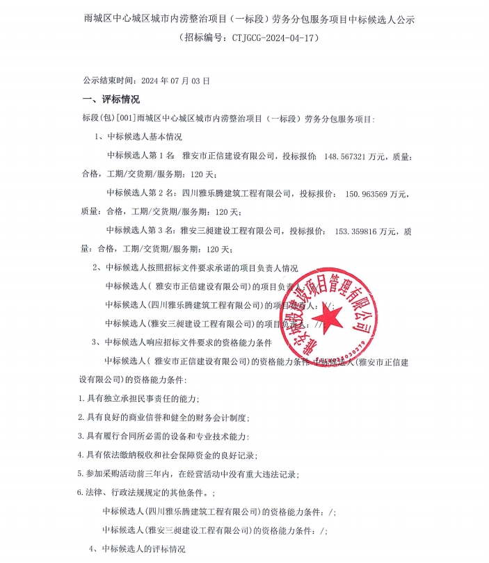 雨城區(qū)中心城區(qū)城市內(nèi)澇整治項(xiàng)目(一標(biāo)段)勞務(wù)分包服務(wù)項(xiàng)目中標(biāo)候選人公示